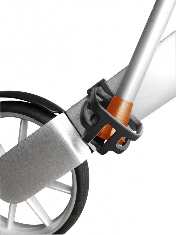 The Elegant crutch holder consists of two parts, an upper and lower part and easily fits onto the frame of the rollator.