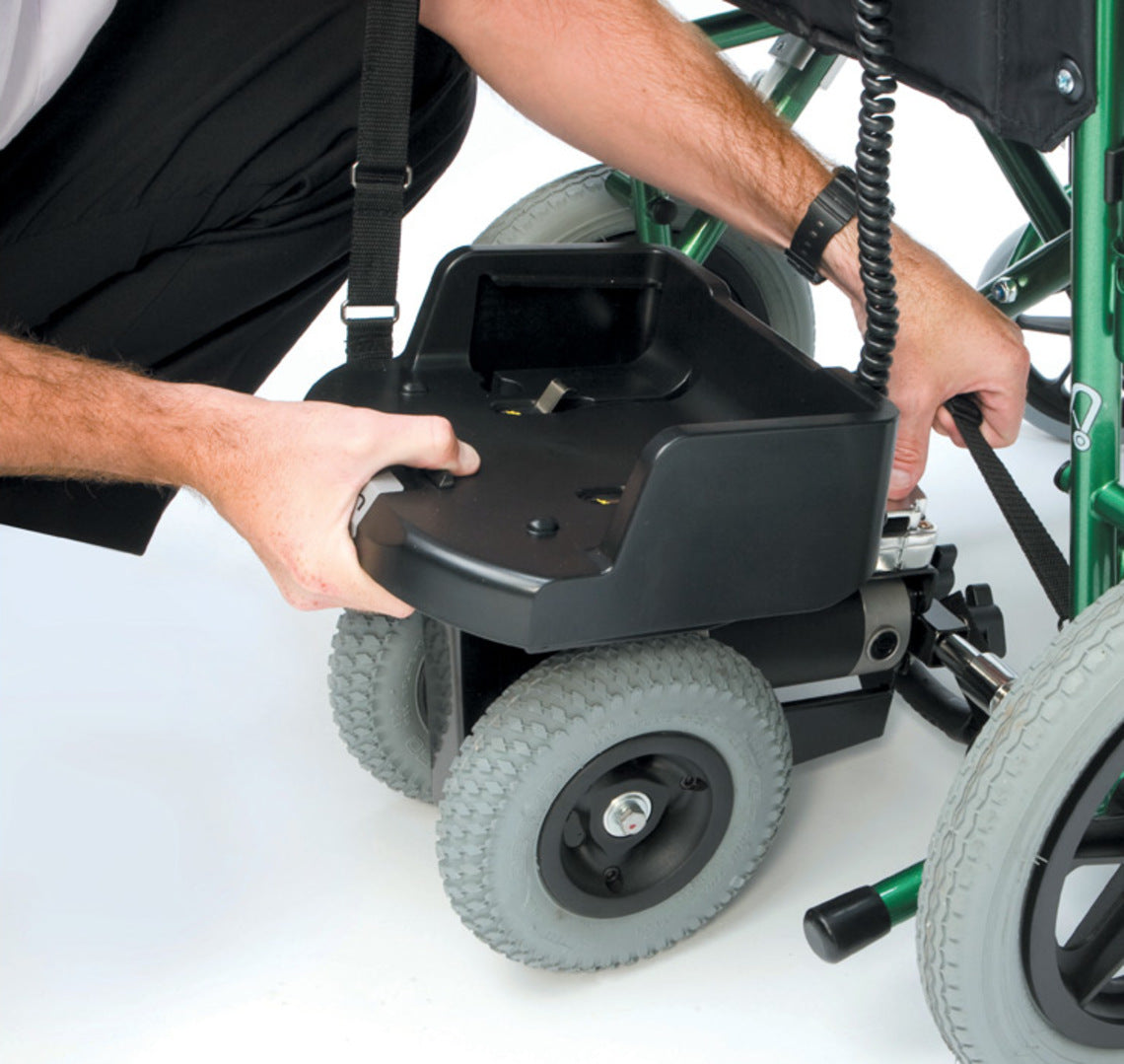 Take the strain out of pushing a heavy wheelchair and make easy work of hills, ramps and gradients. Can easily be fitted and removed within seconds, and adapts to fit most wheelchair sizes.