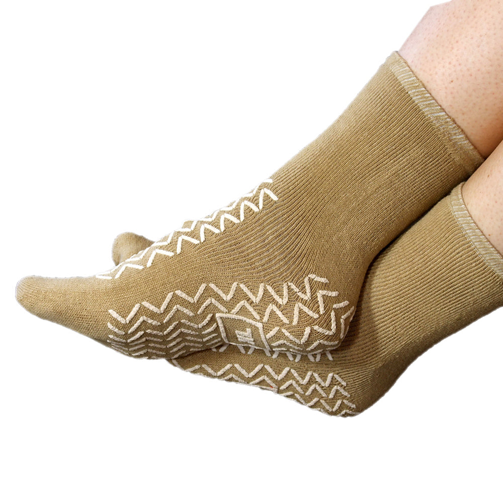 Classic specialized high quality non slip/skid gripper socks designed primarily to prevent falls from those suffering from a condition that affects their stability or likelihood of serious injury in the event of a fall.